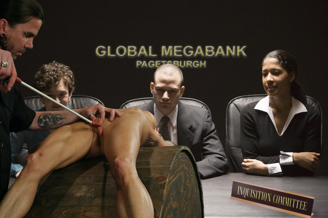 Someone has been putting anonymous posts on social media saying how badly Global Megabank treats its employees. This has got to be stopped. Mrs Albion has been selected to be the culprit and has now been brought before the Inquisition Committee for... moreSomeone has been putting anonymous posts on social media saying how badly Global Megabank treats its employees. This has got to be stopped. Mrs Albion has been selected to be the culprit and has now been brought before the Inquisition Committee for questioning. She denies it completely of course so will now be tortured until she confesses after which she will be sold as a slave in accordance with the terms and conditions in her contract of employment.